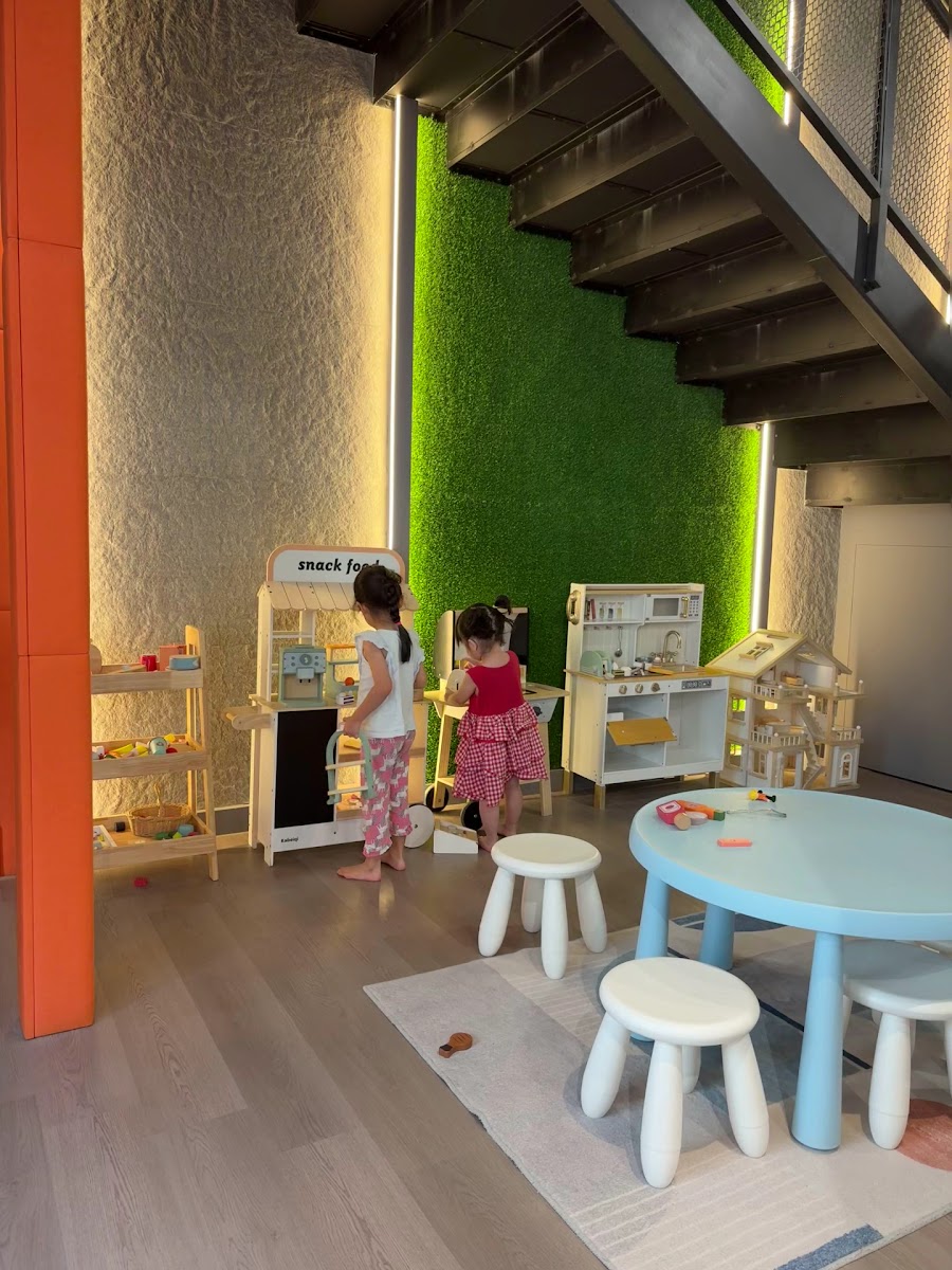 The atmosphere here is distinctly family-friendly without feeling chaotic. The play area is a highlight, featuring a slide, climbing zones, and a particularly interesting sandpit filled with sea salt instead of traditional sand—an allergy-conscious choice that adds a unique sensory experience. There’s also a mini roleplay kitchen that encourages imaginative play, making it clear that Piccolo is designed with children’s comfort and creative exploration in mind.